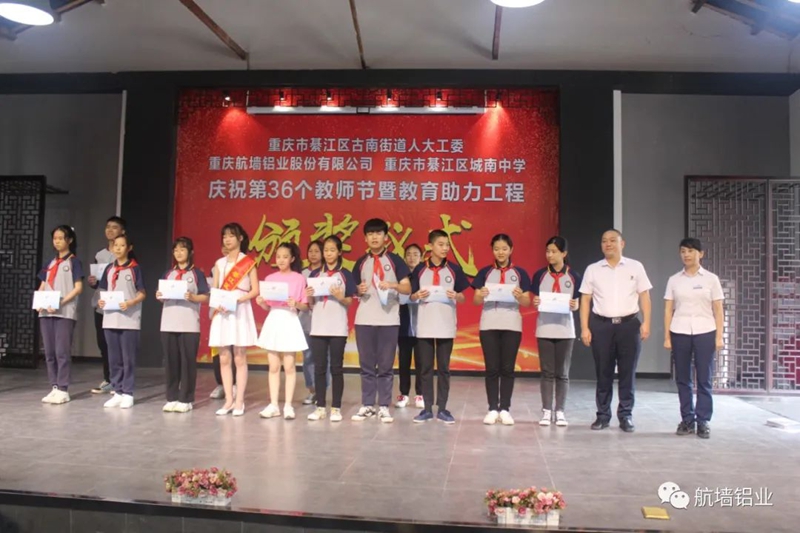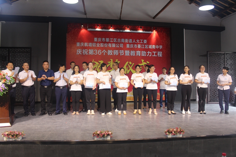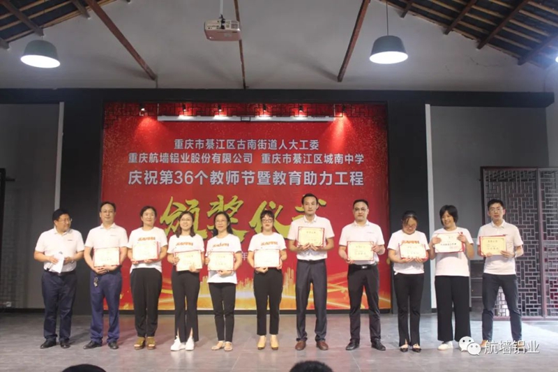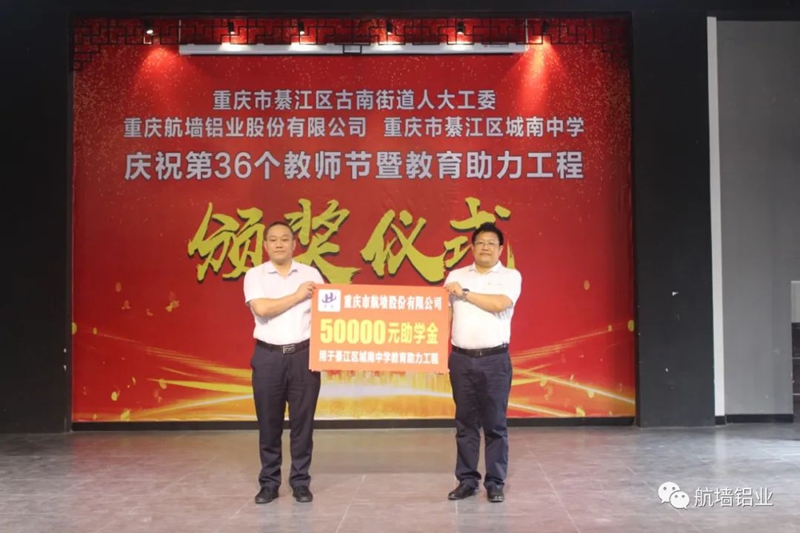 2020年9月10日,重慶航墻鋁業股份有限公司董事長藺勇帶上溫馨的祝福,帶上濃濃的關懷,參加了重慶市綦江區城南中學舉行“慶祝第36個教師節暨教育助力工程頒獎儀式”。