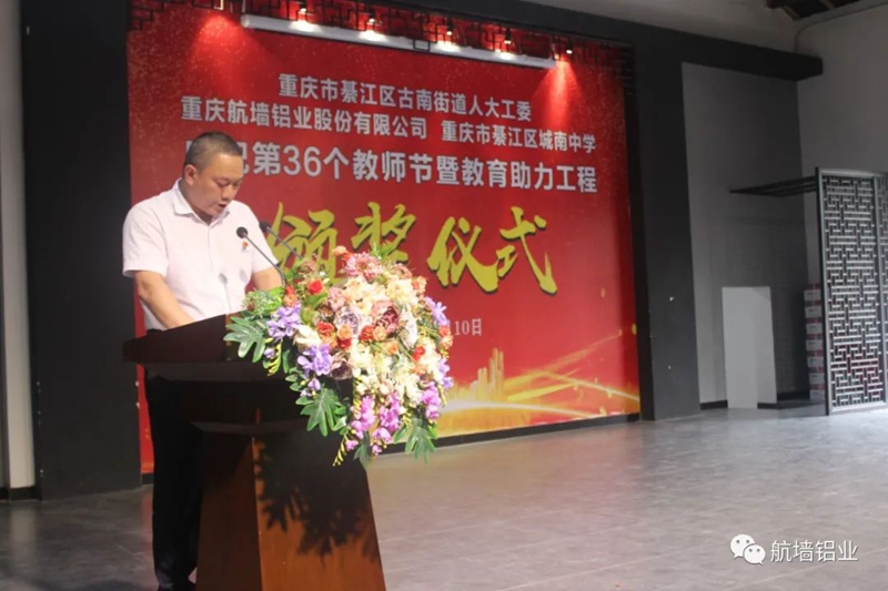 在大會上,董事長藺勇受邀致辭。他親切的問候和誠摯的祝福讓老師們非常感動,也讓學生們倍受鼓舞。他說:捐資興學,參與“教育助力工程”也是我們航墻鋁業公司在不斷發展壯大的同時,熱心公益事業,貢獻社會、回報社會、對社會負責的承諾;也是航墻鋁業公司全體股東重視教育、支持教育、崇尚教育的真實心愿……。